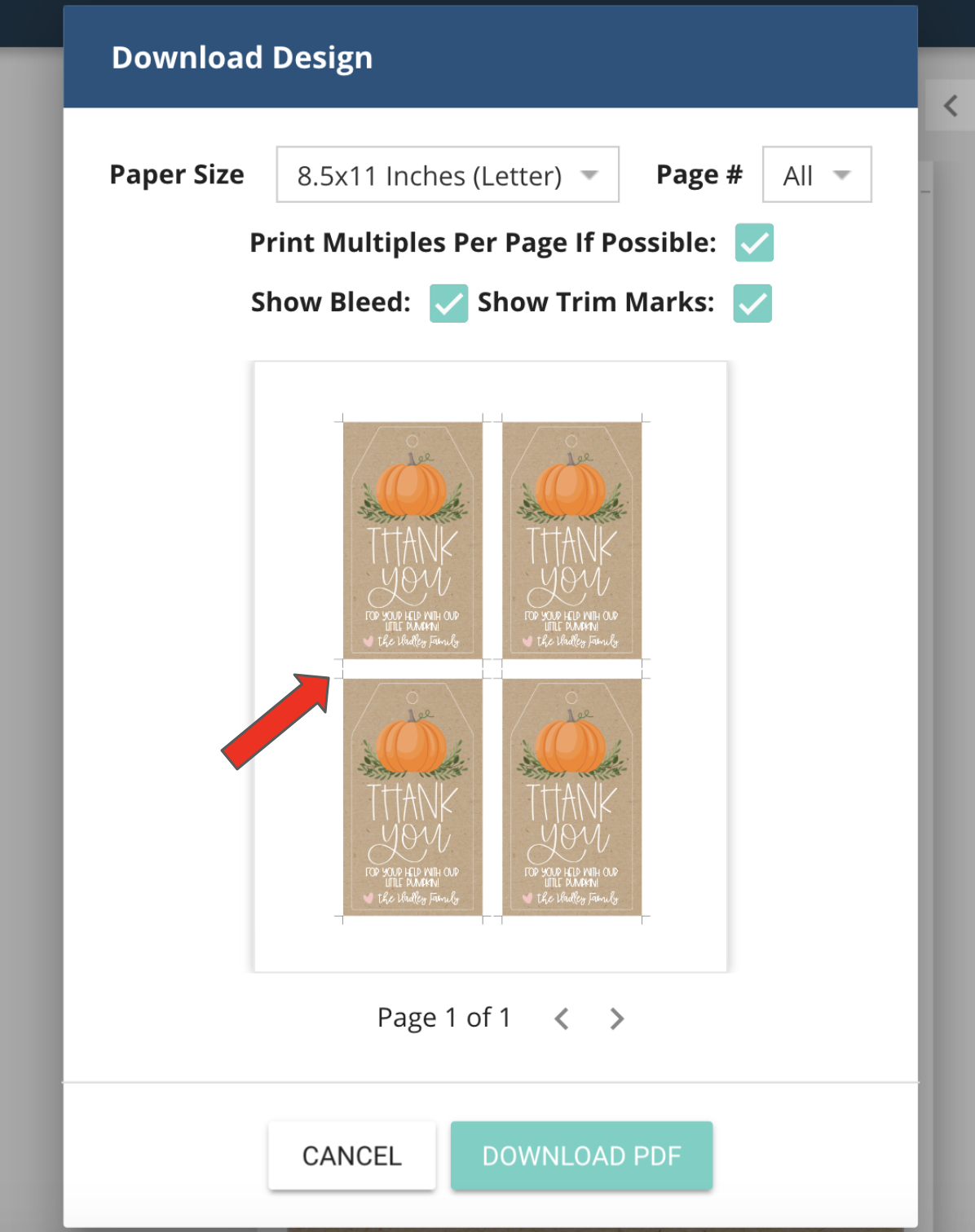 If there are multiple templates per page, you can select to "Show Trim Marks" option to help guide you when trimming your finished product. "Show Bleed" will provide more room for error when trimming.